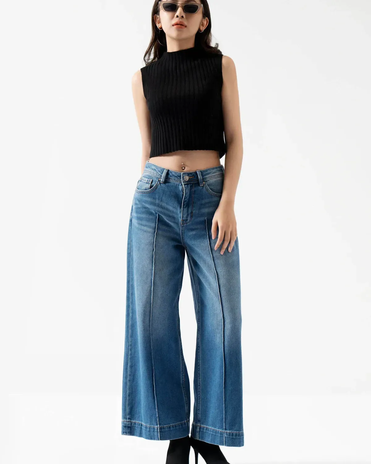 Phong cách năng động và che khéo vòng 3 với quần ống rộng.